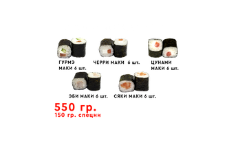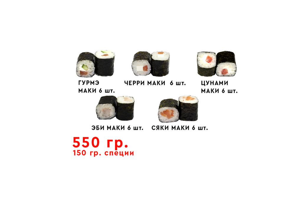 Маки ассорти 990 руб. В корзину Маки ассорти Маки ассорти Описание Комментарии 0 Описание Состав: чери,сяки маки, гурмэ, эби маки, цунами, 2 набора специй. Вес роллов 550 г. вес специй 150 г. Комментарии 0 Нет комментариев Добавить комментарий