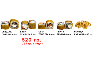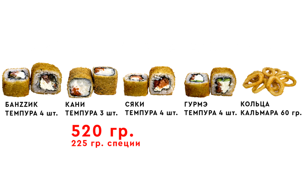 Мини темпура ассорти 800 руб. В корзину Мини темпура ассорти Мини темпура ассорти Описание Комментарии 0 Описание Состав: 1/2 порции сяки темпура, 1/2 порции гурме темпура, 1/2 порции банзик темпура, 1/2 порции кани темпура, 1/2 порции колца кальмара, 3 набора специй. Вес роллов 460 г. вес специй 225 г. Комментарии 0 Нет комментариев Добавить комментарий